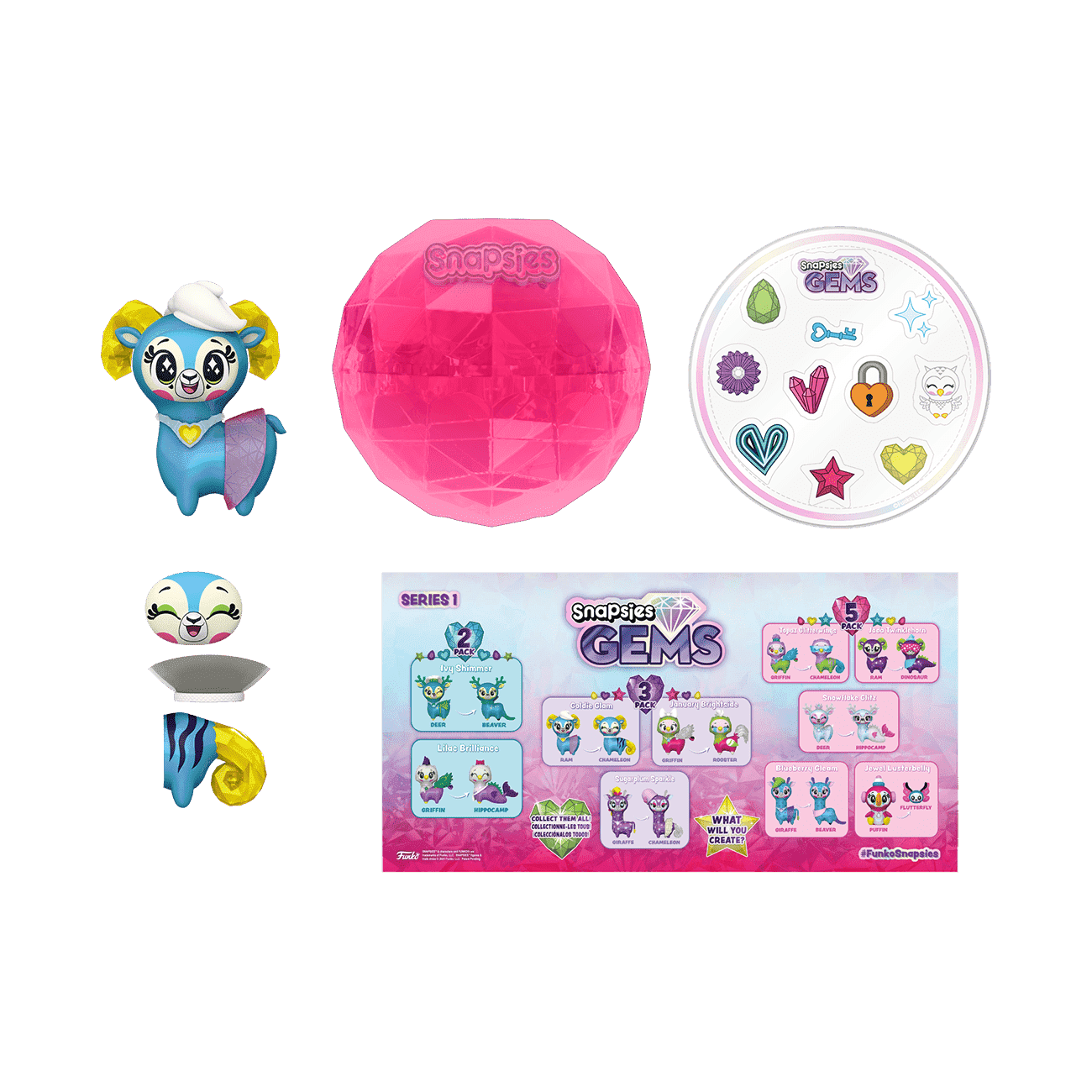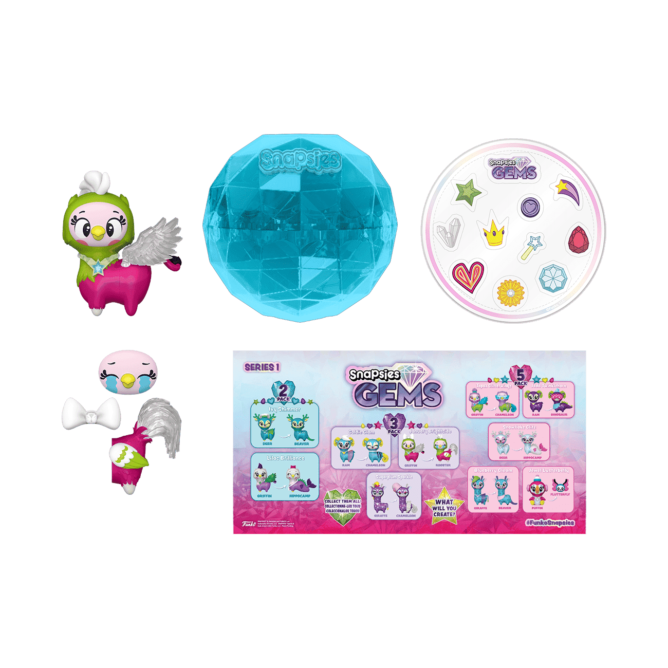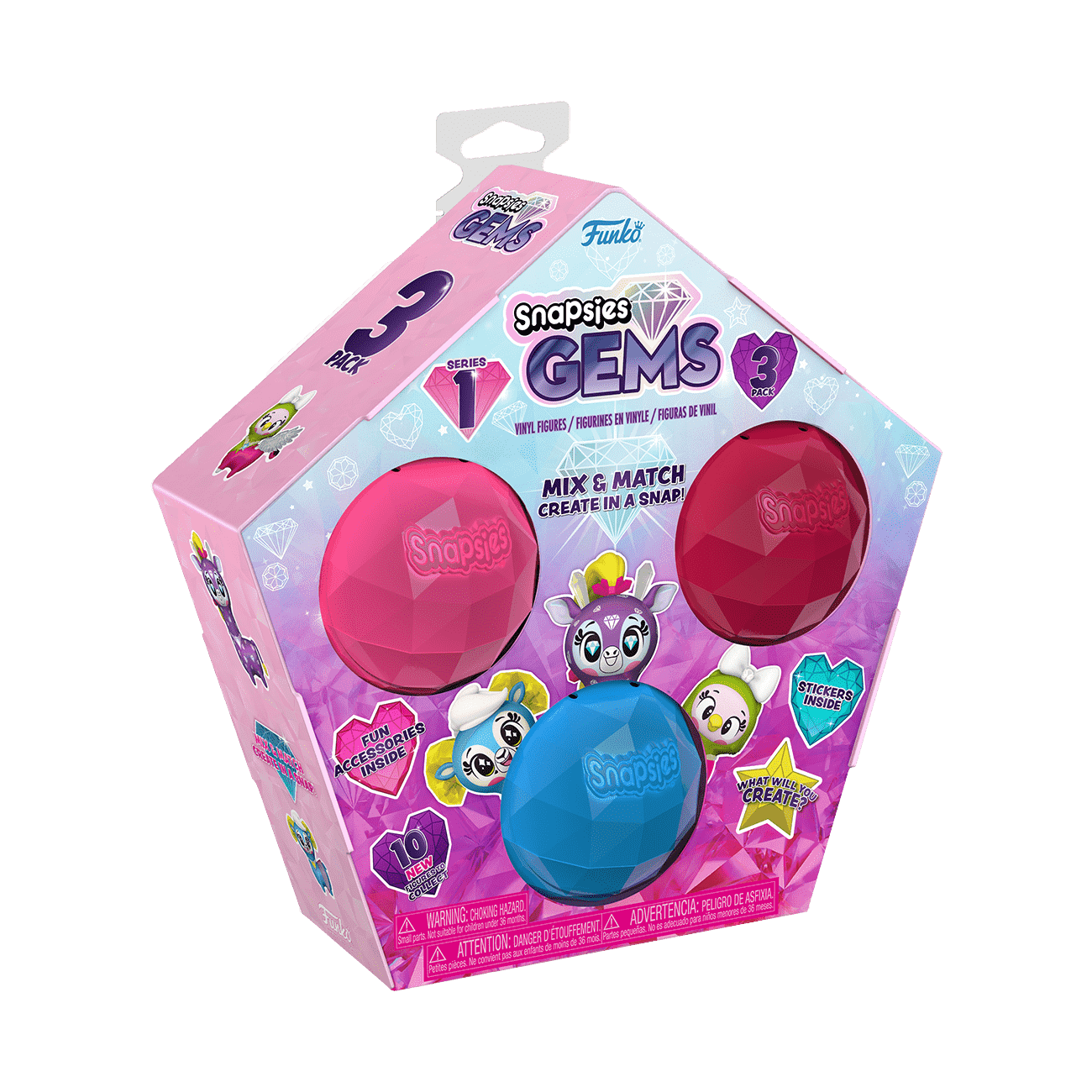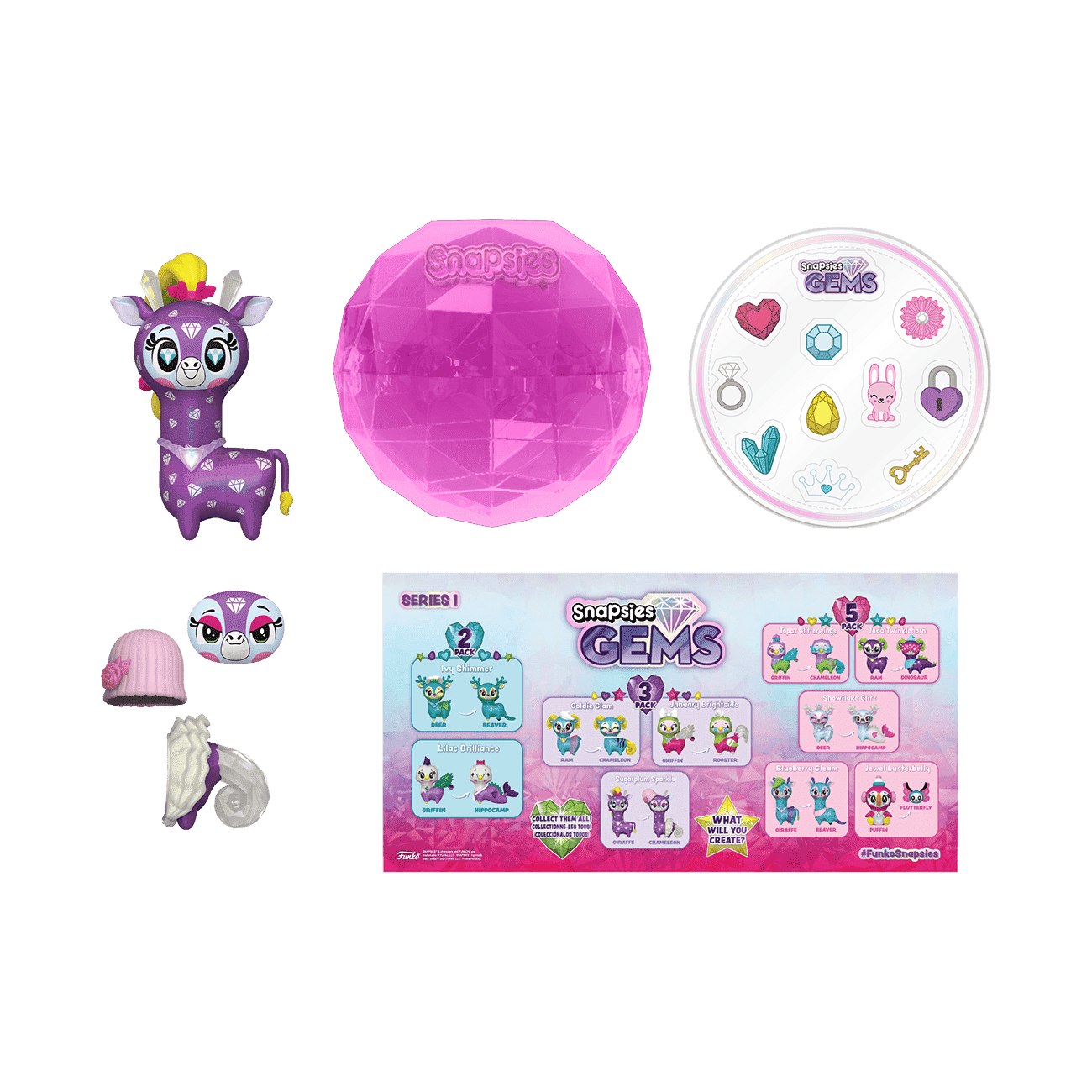 SNAPSIES GEMS™ combine new animals with four new shiny gem accessories! Funko’s patent pending snap technology lets you play your way! Mix and match, create in a snap! Vinyl figures range in size depending on characters/parts combined; average height is approximately 2.5 in (6.4 cm) tall.
