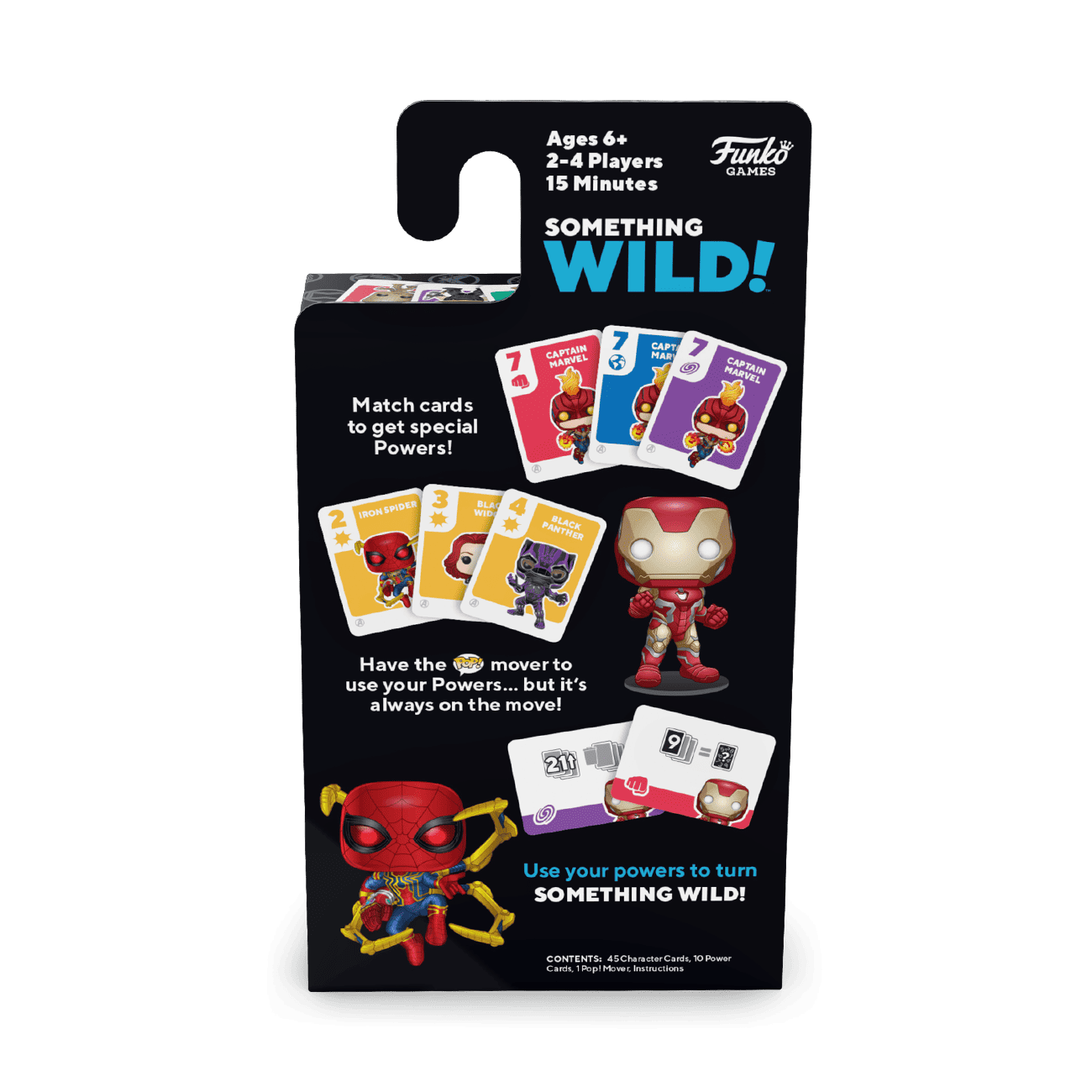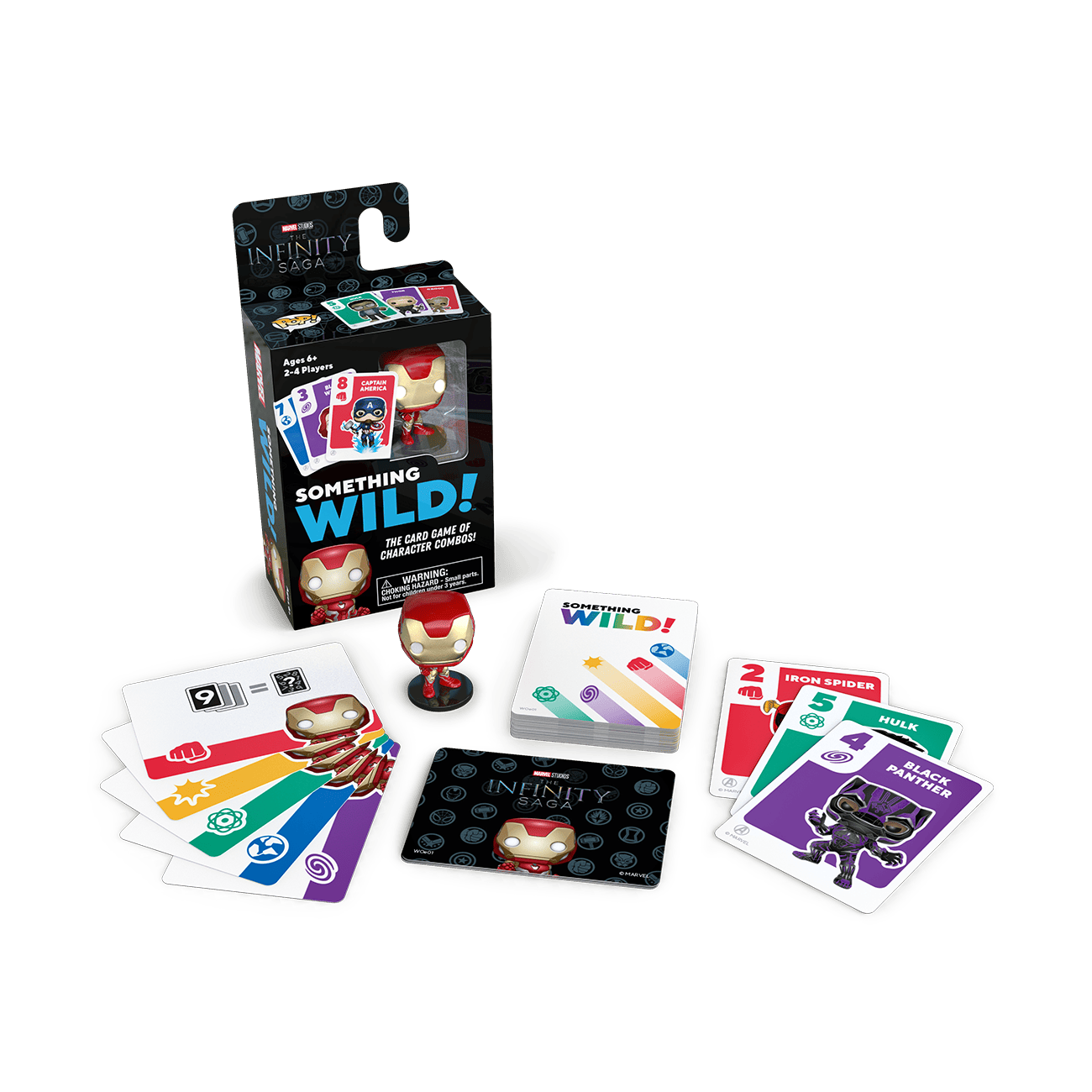 Something Wild! Marvel Infinity Saga is a fast-paced, light card game for the whole family! Featuring an exclusive collectible Iron Man Pop! game mover, as well as your favorite characters from Marvel Studio’s Infinity Saga. Combine Character Cards in sets and runs to score points. Use Power Cards to add a fun twist to the classic card gameplay.