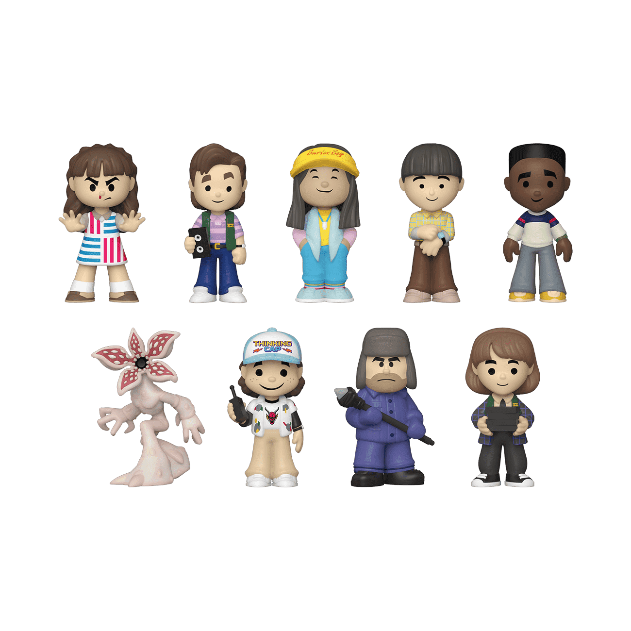 Hawkins, Indiana is a small town full of big secrets, but the word is out about Stranger Things Funko Minis! Collect your favorite characters from Stranger Things in this new assortment of figures! There's Eleven, Will, Lucas, Dustin, Hopper, Steve, Robin, Argyle, and Demogorgon. Vinyl figure is maximum 3 in (7.6 cm) tall, varies depending on figure. One figure per single package purchase.