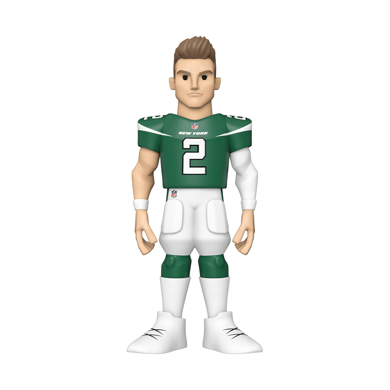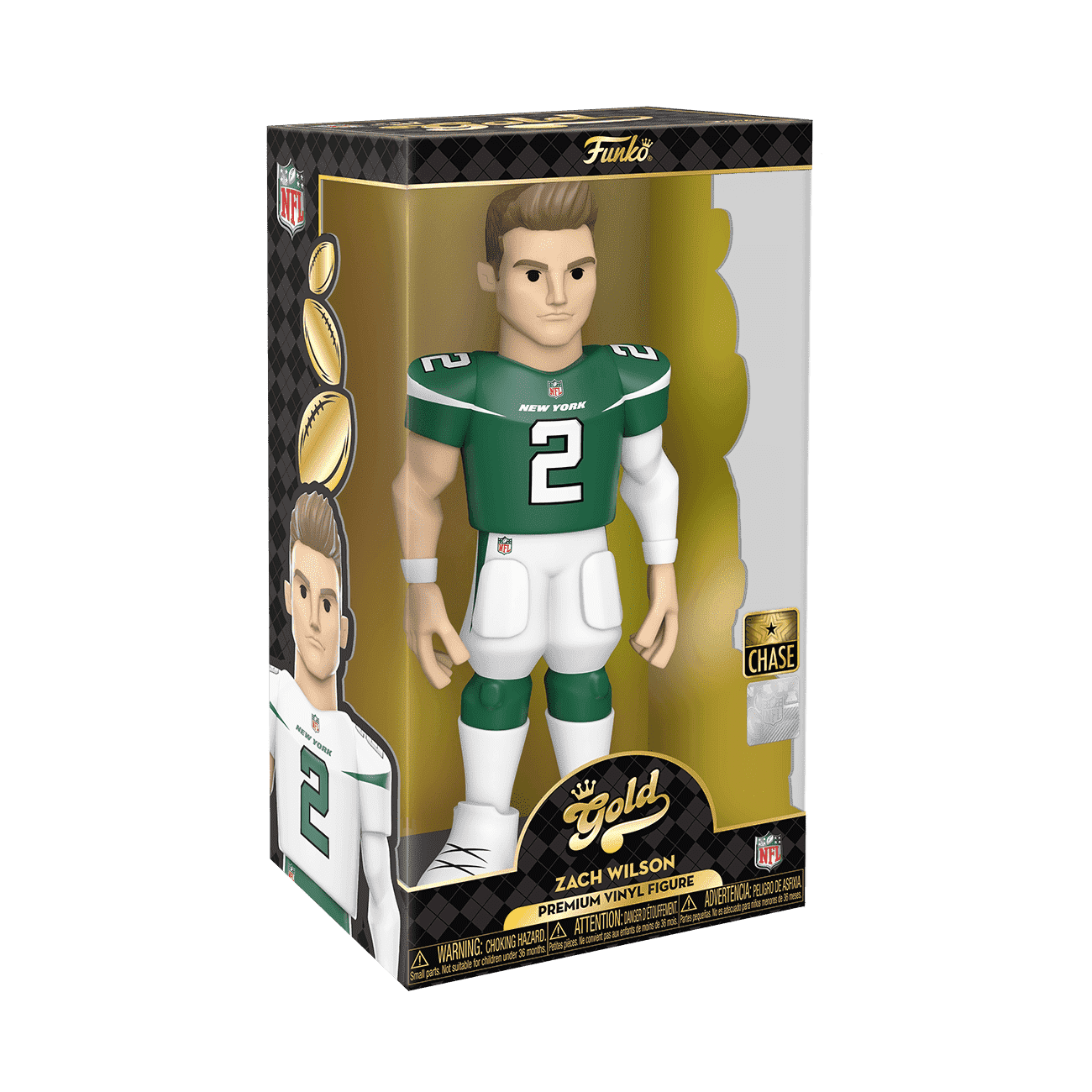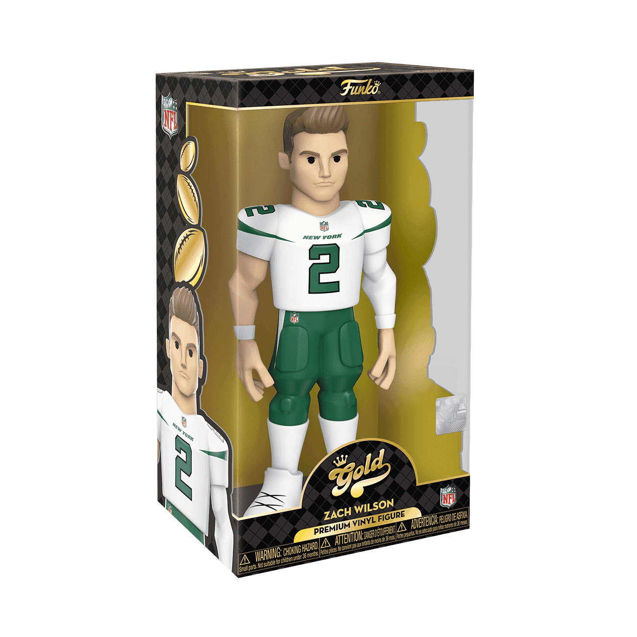 Score a touchdown for your National Football League collection with the new Funko GOLD™ 12” NFL Zach Wilson from the New York Jets. This 12-inch tall collectible of Zach Wilson has him dressed in his white jersey. There’s a 1 in 6 chance you may find the chase of Zach Wilson in his green jersey. GOLD is the perfect way to commemorate some of your favorite NFL players in your collection, and each figure comes in a sleek, display-ready box that is easy to stack with other GOLD collectibles. Vinyl figure is 12-inches tall.