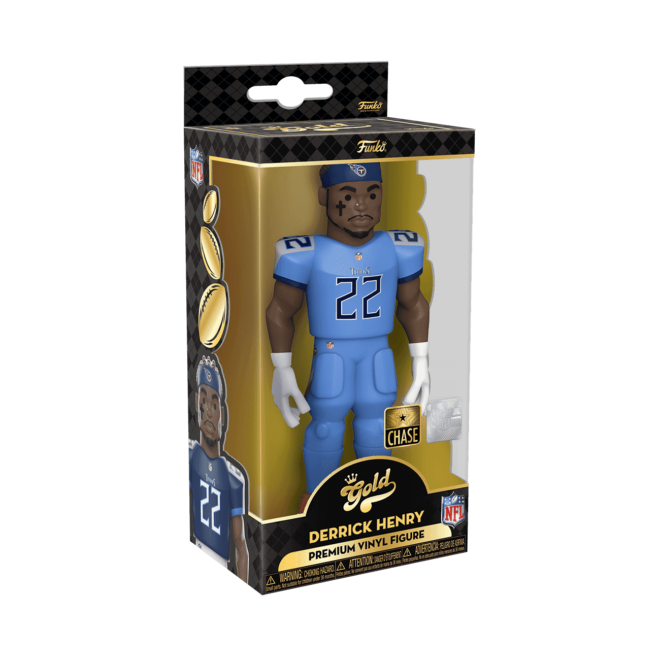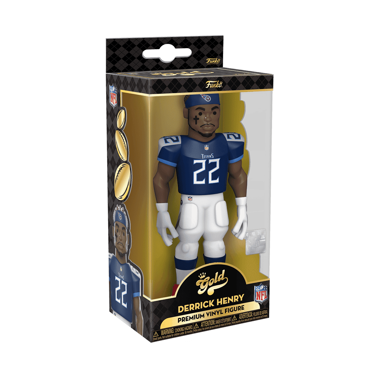 Score a touchdown for your National Football League collection with the new Funko GOLD™ 5” NFL Titans Derrick Henry. This 5-inch tall collectible of Derrick Henry has him dressed in his home game uniform. GOLD is the perfect way to commemorate some of your favorite NFL players in your collection, and each figure comes in a sleek, display-ready box that is easy to stack with other GOLD collectibles. There’s a 1 in 6 chance you may find the chase variant of Derrick Henry in his color rush uniform. Vinyl figure is approximately 5-inches tall.