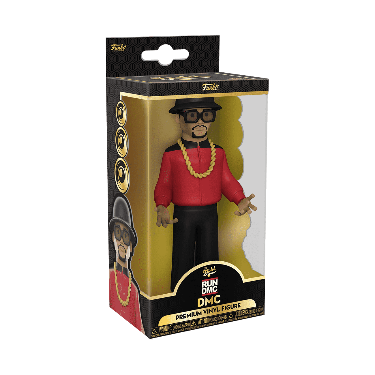 Go for GOLD in your music collection with the new Funko GOLD DMC from Run-DMC. Funko GOLD DMC is dressed to the nines in signature, trend-setting hip-hop style and adidasĀ® shoes. GOLD is the perfect way to commemorate some of your favorite, iconic music artists in your collection, and each figure comes in a sleek, display-ready box that is easy to stack with other GOLD collectibles. Vinyl figure is 5 in (12.7 cm) tall.