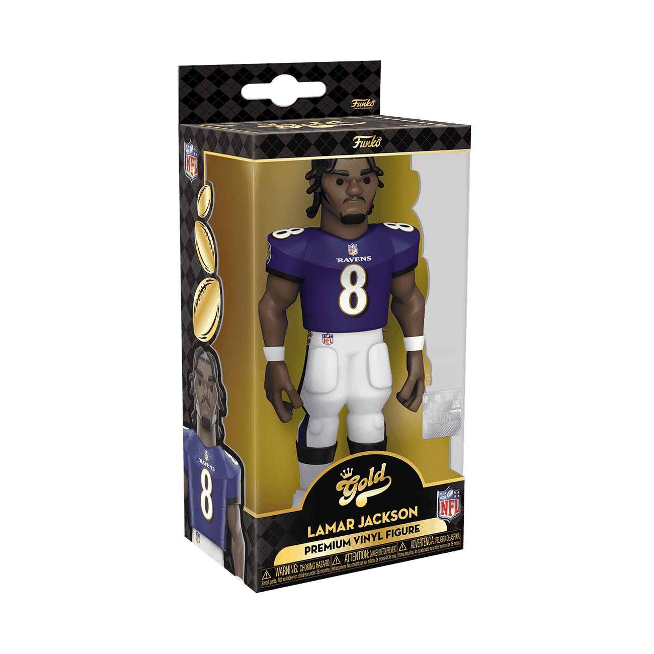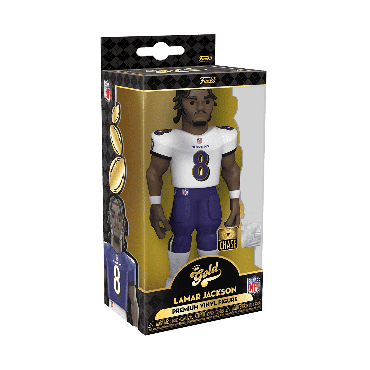 Score a touchdown for your National Football League collection with the new Funko GOLD Lamar Jackson premium vinyl figure. This 5-inch tall collectible of Lamar Jackson has him dressed in his home game uniform. GOLD is the perfect way to commemorate some of your favorite NFL players in your collection, and each figure comes in a sleek, display-ready box that is easy to stack with other GOLD collectibles. There’s a 1 in 6 chance you may find the chase variant of Lamar Jackson in his away game uniform. Vinyl figure is 5-inches tall.