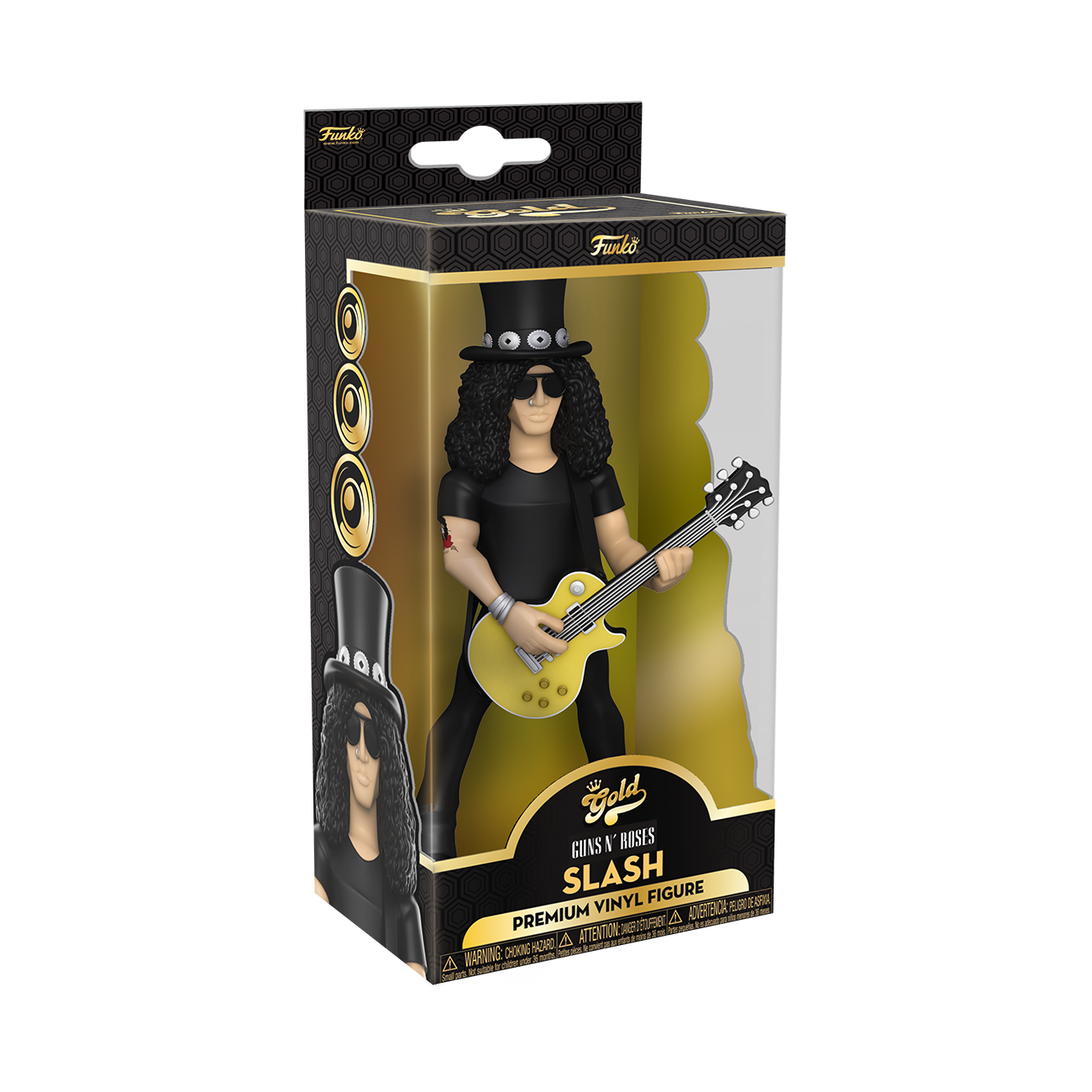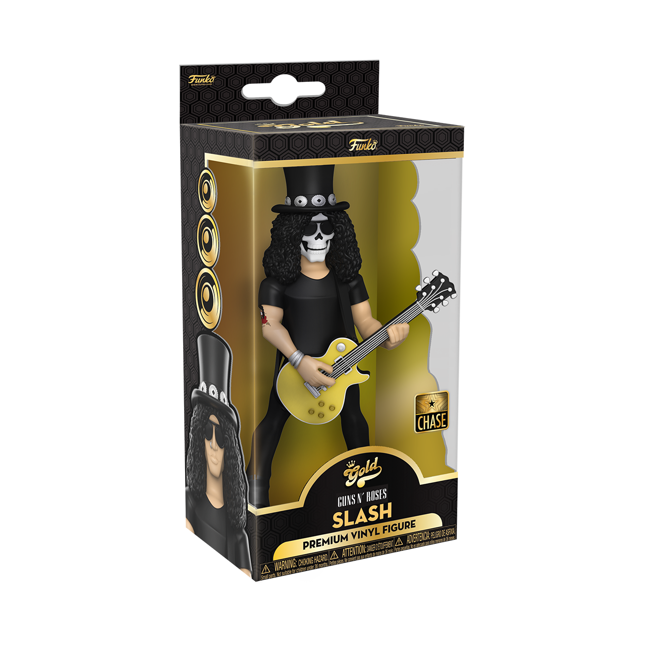 Go for GOLD in your music collection with the new Funko GOLD, premium vinyl figure of legendary guitarist, Slash. There's a 1 in 6 chance you may even find the chase of Slash wearing his iconic skull face paint. GOLD is the perfect way to commemorate some of your favorite, iconic music artists in your collection, and each figure comes in a sleek, display-ready box that is easy to stack with other GOLD collectibles. Vinyl figure is 5 in (12.7 cm) tall. Please note: Chase variants are shipped at random. Receiving a chase with purchase is not guaranteed.