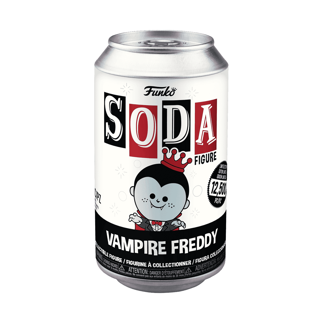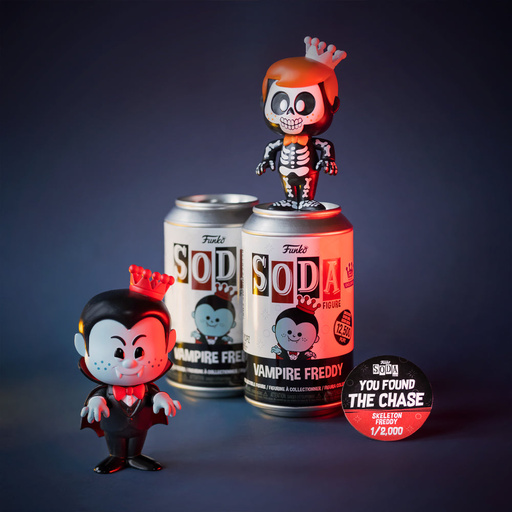 While dressed as a vampire, Freddy’s in the spooky season spirit! Bring some lighthearted jump scares and fun to your Funko Soda collection with a Funko exclusive Soda of Funko’s freckle-faced mascot! Only 12,500 of this collectible were made and there's a 1 in 6 chance that you may find the chase of Skeleton Freddy! Vinyl figure is approximately 3.75 in (9.5 cm) tall.