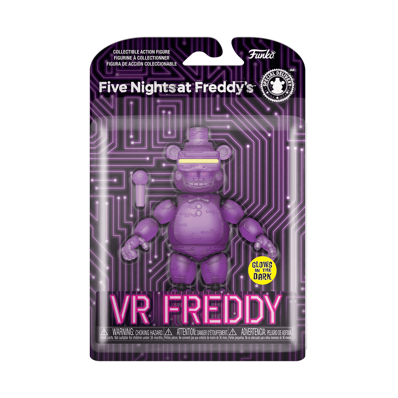 Five Nights at Freddy's: Special Delivery has unleashed a whole new range of terror with a glow-in-the-dark twist. Will your FNAF collection survive after the VR Freddy with microphone action figure steps amidst the other animatronic figures? Collectible action figure has multiple points of articulation, is purple, glows in the dark, and is approximately 5.46 in (13.9 cm) tall.
