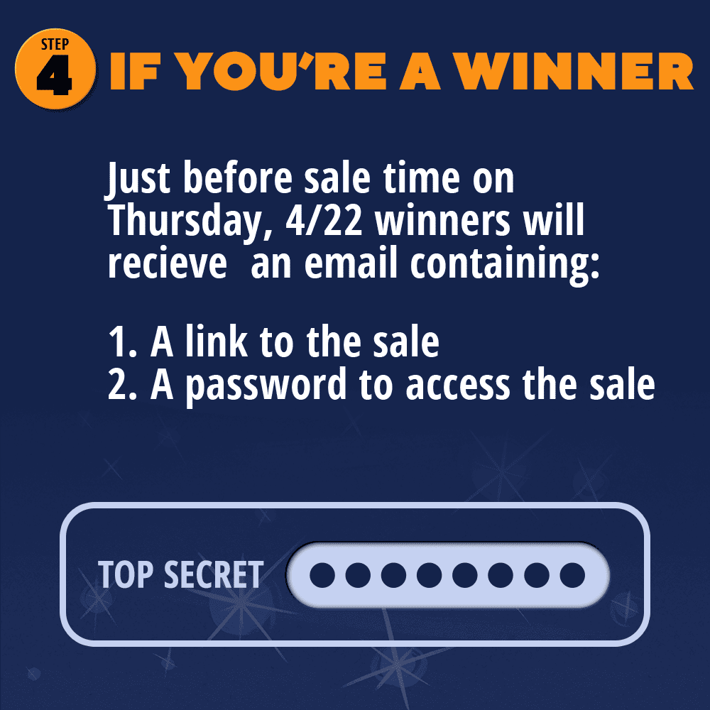 - Right before the winners' assigned time slot on April 22nd, 2021, lottery winners will receive an email containing a link to the event and your password to access the sale.