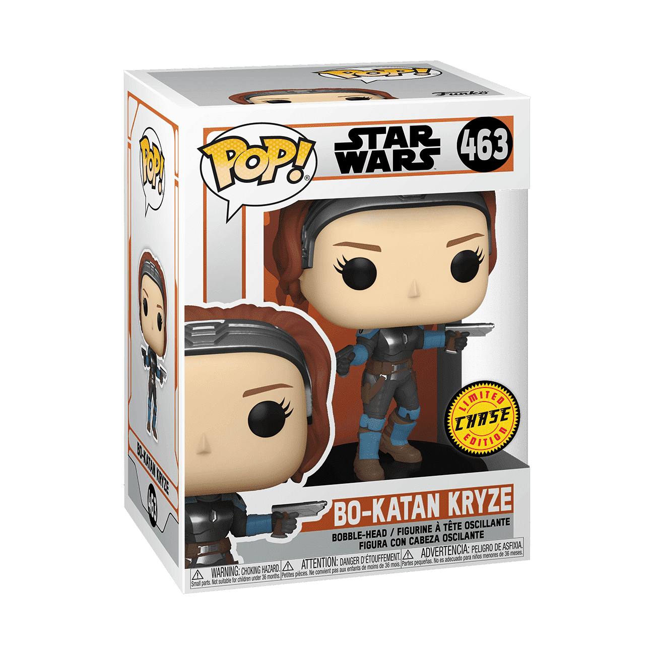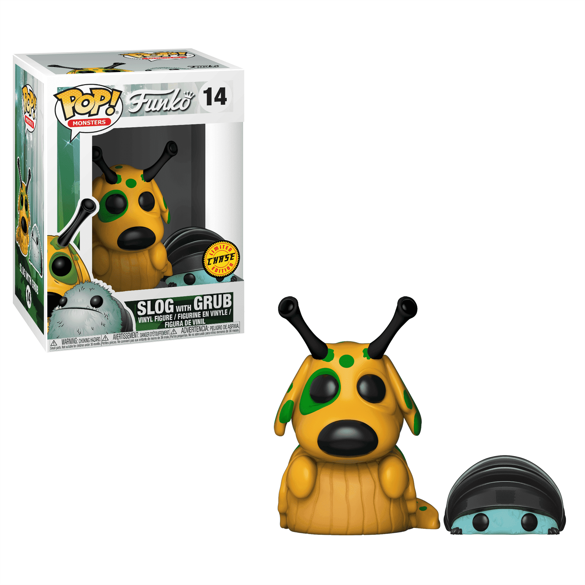 Some collections have characters that have a "chase" variant which is an alternate version of the character that is slightly different from the original. Sometimes the chase version is wearing an alternate outfit, others the chase could be glow-in-the-dark. There is usually a 1 in 6 chance of finding/collecting a chase variant of a figure. Some older collections had even slimmer odds of finding a chase. Some examples of figures that have a chase variant are Pop! Bo-Katan Kryze (The Manadolrian™ set), Pop! Chilli (Pop! Music TLC collection), and Pop! Slog with Grub (Funko's Wetmore Forest collection).