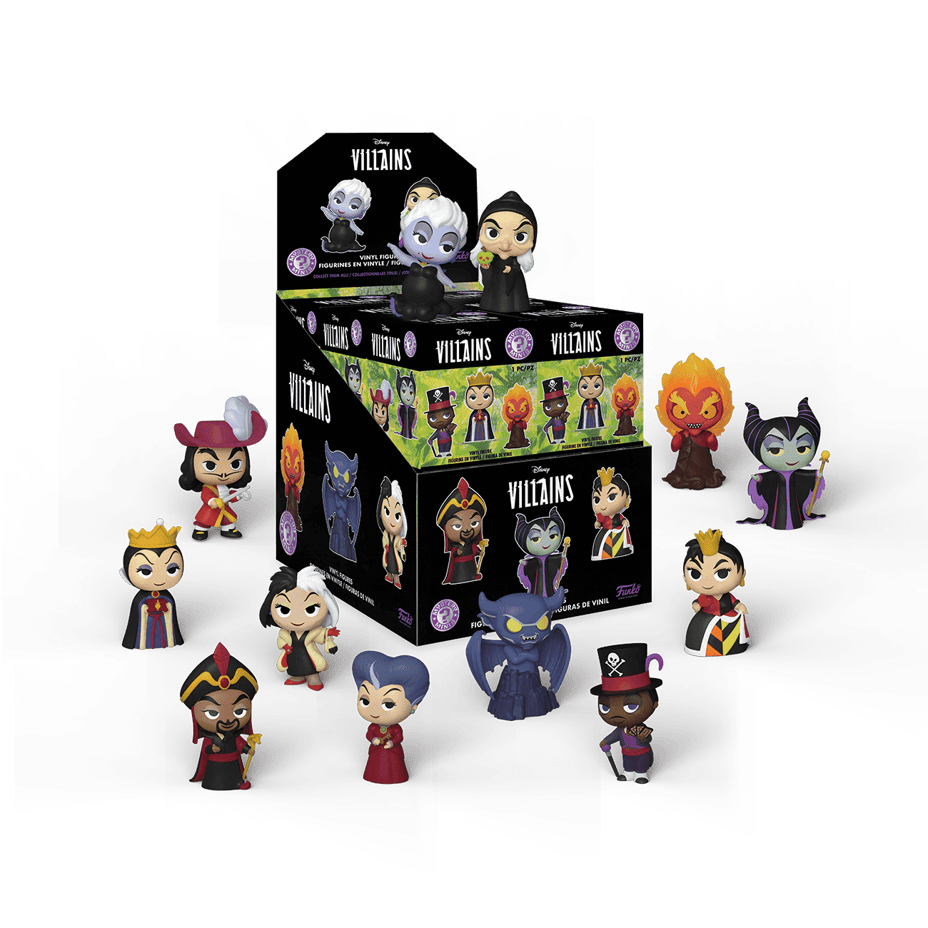 Your Disney collection is in for a tumultuous time with these Disney Villains Mystery Minis. There's Maleficent, Captain Hook, Ursula, Jafar, Evil Queen Grimhilde, Cernabog, Queen Grimhilde as a Hag, Hades, Cruella de Vil, Doctor Facilier, Queen of Hearts, and Lady Tremaine. Vinyl figures range in height, depending on character, from approximately 7 cm to 9 cm tall. Please note: Item selection is random, as each piece is in blind packaging. We cannot accept requests for specific items.